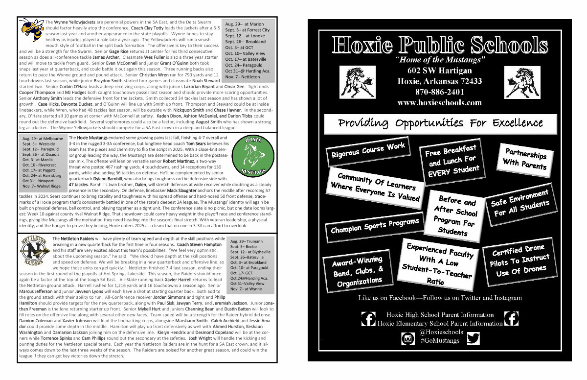 The Hoxie Mustangs endured some growing pains last fall, finishing 4-7 overall and 3-4 in the rugged 3-3A conference, but longtime head coach Tom Sears believes his team has the pieces and chemistry to flip the script in 2025. With a close-knit senior group leading the way, the Mustangs are determined to be back in the postseason mix. The offense will lean on versatile senior Robert Martinez, a two-way threat who posted 467 rushing yards, 4 touchdowns, and 14 receptions for 130 yards, while also adding 36 tackles on defense. He’ ll be complemented by senior quarterback Dylann Barnhill, who also brings toughness on the defensive side with 47 tackles. Barnhill ' s twin brother, Dalen, will stretch defenses at wide receiver while doubling as a steady presence in the secondary. On defense, linebacker Mack Slaughter anchors the middle after recording 57 tackles in 2024. Sears continues to bring stability and toughness with his spread offense and hard-nosed 50 front defense, trademarks of a Hoxie program that’ s consistently battled in one of the state’ s deepest 3A leagues. The Mustangs’ identity will again be built on physical defense, ball control, and playing together as a tight unit. The conference slate is no picnic, but one date looms largest: Week 10 against county rival Walnut Ridge. That showdown could carry heavy weight in the playoff race and conference standings, giving the Mustangs all the motivation they need heading into the season’ s final stretch. With veteran leadership, a physical identity, and the hunger to prove they belong, Hoxie enters 2025 as a team that no one in 3-3A can afford to overlook.