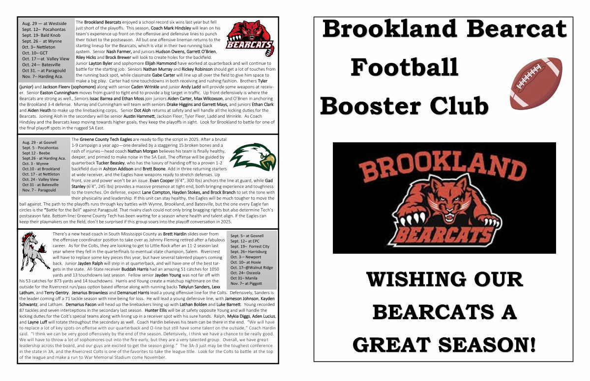 The Greene County Tech Eagles are ready to flip the script in 2025. After a brutal 1-9 campaign a year ago— one derailed by a staggering 15 broken bones and a rash of injuries— head coach Nathan Morgan believes his team is finally healthy, deeper, and primed to make noise in the 5A East. The offense will be guided by quarterback Tucker Beasley, who has the luxury of handing off to a proven 1-2 backfield duo in Ashton Addison and Brett Boone. Add in three returning starters at wide receiver, and the Eagles have weapons ready to stretch defenses. Up front, size and power won’ t be an issue. Evan Cooper( 6’ 4”, 300 lbs) anchors the line at guard, while Gad Stanley( 6’ 4”, 245 lbs) provides a massive presence at tight end, both bringing experience and toughness to the trenches. On defense, expect Lane Compton, Hayden Stokes, and Brock Branch to set the tone with their physicality and leadership. If this unit can stay healthy, the Eagles will be much tougher to move the ball against. The path to the playoffs runs through key battles with Wynne, Brookland, and Batesville, but the one every Eagle fan circles is the“ Battle for the Bell” against Paragould. That rivalry clash could not only bring bragging rights but also determine Tech’ s postseason fate. Bottom line: Greene County Tech has been waiting for a season where health and talent align. If the Eagles can keep their playmakers on the field, don’ t be surprised if this group soars into the playoff conversation in 2025.