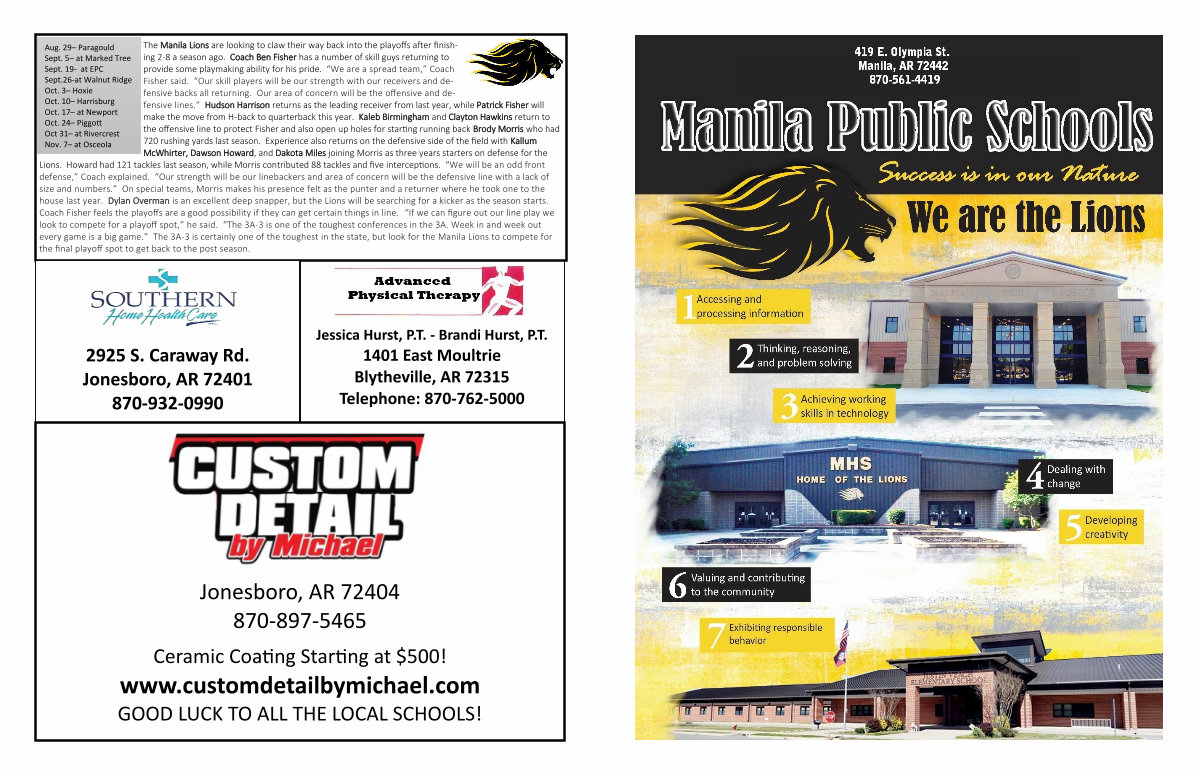 Lions. Howard had 121 tackles last season, while Morris contributed 88 tackles and five interceptions.“ We will be an odd front defense,” Coach explained.“ Our strength will be our linebackers and area of concern will be the defensive line with a lack of size and numbers.” On special teams, Morris makes his presence felt as the punter and a returner where he took one to the house last year. Dylan Overman is an excellent deep snapper, but the Lions will be searching for a kicker as the season starts. Coach Fisher feels the playoffs are a good possibility if they can get certain things in line.“ If we can figure out our line play we look to compete for a playoff spot,” he said.“ The 3A-3 is one of the toughest conferences in the 3A. Week in and week out every game is a big game.” The 3A-3 is certainly one of the toughest in the state, but look for the Manila Lions to compete for the final playoff spot to get back to the post season.