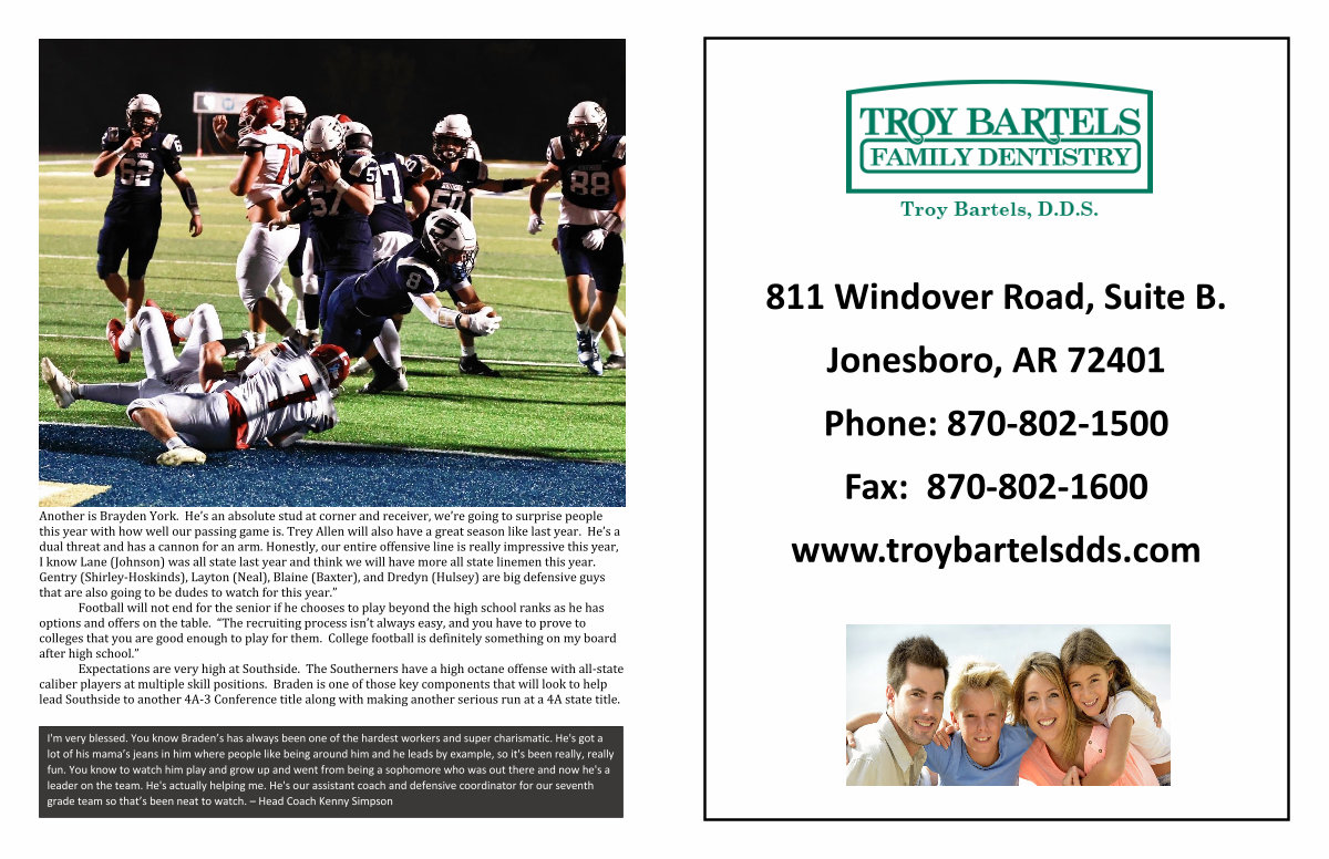 Expectations are very high at Southside. The Southerners have a high octane offense with all-state caliber players at multiple skill positions. Braden is one of those key components that will look to help lead Southside to another 4A-3 Conference title along with making another serious run at a 4A state title.