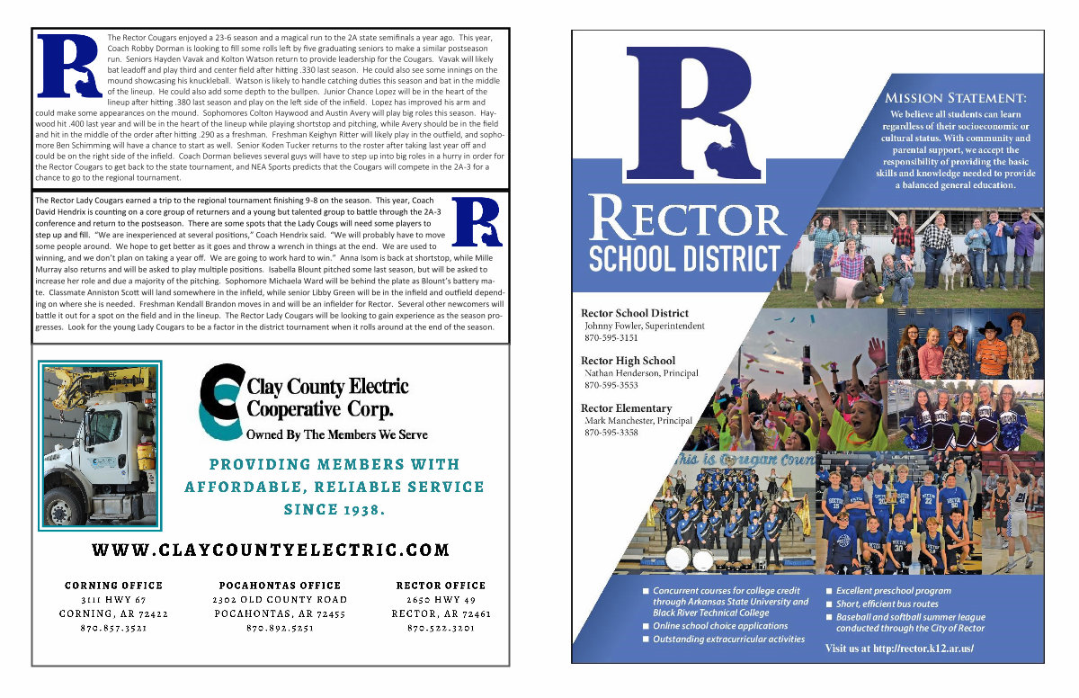 The Rector Lady Cougars earned a trip to the regional tournament finishing 9-8 on the season. This year, Coach David Hendrix is counting on a core group of returners and a young but talented group to battle through the 2A-3 conference and return to the postseason. There are some spots that the Lady Cougs will need some players to step up and fill.“ We are inexperienced at several positions,” Coach Hendrix said.“ We will probably have to move some people around. We hope to get better as it goes and throw a wrench in things at the end. We are used to winning, and we don’ t plan on taking a year off. We are going to work hard to win.” Anna Isom is back at shortstop, while Mille Murray also returns and will be asked to play multiple positions. Isabella Blount pitched some last season, but will be asked to increase her role and due a majority of the pitching. Sophomore Michaela Ward will be behind the plate as Blount’ s battery mate. Classmate Anniston Scott will land somewhere in the infield, while senior Libby Green will be in the infield and outfield depending on where she is needed. Freshman Kendall Brandon moves in and will be an infielder for Rector. Several other newcomers will battle it out for a spot on the field and in the lineup. The Rector Lady Cougars will be looking to gain experience as the season progresses. Look for the young Lady Cougars to be a factor in the district tournament when it rolls around at the end of the season.