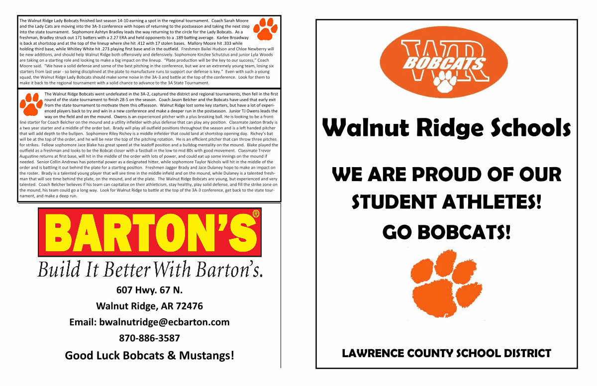 607 Hwy. 67 N. Walnut Ridge, AR 72476 Email: bwalnutridge @ ecbarton. com 870-886-3587 Good Luck Bobcats & Mustangs!
