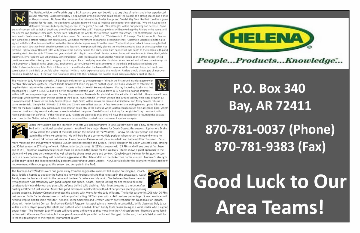 Coach Trey Gossett and the Trumann Wildcats will look to improve in 2025 as they move into a new conference in the 4A-3 with traditional baseball powers. Youth will be a major theme for Coach Gossett this season. Sophomore Drake Harlow will be the leader at the plate and on the mound for the Wildcats. Harlow hit. 412 last season and led the team in five offensive categories. He will likely be at a corner outfield position when not on the mound where he struck out 34 batters last season. Junior Brayden Passmore will play centerfield and bat leadoff for Trumann. Passmore moves up the lineup where he had a. 395 on-base percentage and 12 RBIs. He will also pitch for Coach Gossett’ s club, striking out 30 last season in 17 innings of work. Fellow junior Jacob Jones hit. 233 last season with 15 RBIs and will see time at first base and at DH. Freshman Cayden Steele should make an impact in the lineup for the Wildcats. Steele shows a great approach to the plate and will see time on the mound as well where he shows great poise and control. Coach Gossett believes for his guys to compete in a new conference, they will need to be aggressive at the plate and fill up the strike zone on the mound. Trumann’ s strength will be team speed and experience in key positions according to Coach Gossett. NEA Sports looks for the Trumann Wildcats to show improvement with a young squad this season and compete in the 4A-3.
