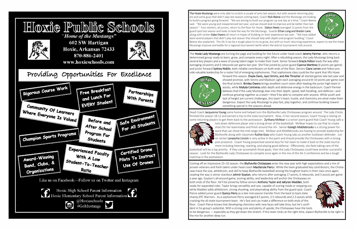 The Hoxie Mustangs were only able to scratch a couple of wins last season, but with several returning players and some guys that didn’ t play last season coming back, Coach Nick Beene and the Mustangs are looking to build a program going forward.“ We are aiming to build our program up one day at a time,” Coach Beene said.“ We were young and inexperienced last year, and we should look to improve and be better than last season.” Four starters, all juniors, return to the floor for Hoxie. Dalton Neely averaged 12 points from the guard spot last season and looks to lead the way for the Mustangs. Guards Ethan Long and Braden Lane, along with center Gabe Owens all return in hopes of building on their experience last year.“ We have added back several players that didn’ t play last season that should help with depth and program building,” Coach Beene also explained. The 3A-3 can be a tough place to try to grow, but with so much returning experience, expect to see the Hoxie Mustangs improve and battle for a regional tournament berth when the district tournament rolls around.