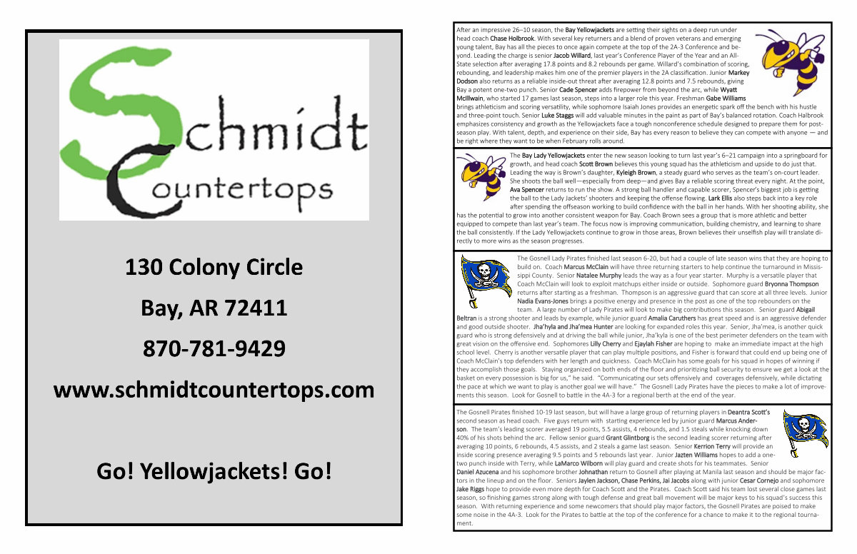 After an impressive 26 – 10 season, the Bay Yellowjackets are setting their sights on a deep run under head coach Chase Holbrook. With several key returners and a blend of proven veterans and emerging young talent, Bay has all the pieces to once again compete at the top of the 2A-3 Conference and beyond. Leading the charge is senior Jacob Willard, last year’ s Conference Player of the Year and an All- State selection after averaging 17.8 points and 8.2 rebounds per game. Willard’ s combination of scoring, rebounding, and leadership makes him one of the premier players in the 2A classification. Junior Markey Dodson also returns as a reliable inside-out threat after averaging 12.8 points and 7.5 rebounds, giving Bay a potent one-two punch. Senior Cade Spencer adds firepower from beyond the arc, while Wyatt McIllwain, who started 17 games last season, steps into a larger role this year. Freshman Gabe Williams brings athleticism and scoring versatility, while sophomore Isaiah Jones provides an energetic spark off the bench with his hustle and three-point touch. Senior Luke Staggs will add valuable minutes in the paint as part of Bay’ s balanced rotation. Coach Halbrook emphasizes consistency and growth as the Yellowjackets face a tough nonconference schedule designed to prepare them for postseason play. With talent, depth, and experience on their side, Bay has every reason to believe they can compete with anyone— and be right where they want to be when February rolls around.