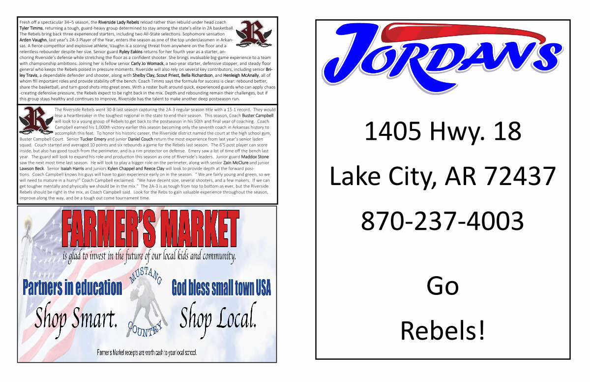 Fresh off a spectacular 34 – 5 season, the Riverside Lady Rebels reload rather than rebuild under head coach Tyler Timms, returning a tough, guard-heavy group determined to stay among the state’ s elite in 2A basketball. The Rebels bring back three experienced starters, including two All-State selections. Sophomore sensation Arden Vaughn, last year’ s 2A-3 Player of the Year, enters the season as one of the top underclassmen in Arkansas. A fierce competitor and explosive athlete, Vaughn is a scoring threat from anywhere on the floor and a relentless rebounder despite her size. Senior guard Ryley Eakins returns for her fourth year as a starter, anchoring Riverside’ s defense while stretching the floor as a confident shooter. She brings invaluable big-game experience to a team with championship ambitions. Joining her is fellow senior Carly Jo Womack, a two-year starter, defensive stopper, and steady floor general who keeps the Rebels poised in pressure moments. Riverside will also rely on several key contributors, including senior Briley Travis, a dependable defender and shooter, along with Shelby Clay, Scout Priest, Bella Richardson, and Henleigh McAnally, all of whom fill important roles and provide stability off the bench. Coach Timms says the formula for success is clear: rebound better, share the basketball, and turn good shots into great ones. With a roster built around quick, experienced guards who can apply chaos-creating defensive pressure, the Rebels expect to be right back in the mix. Depth and rebounding remain their challenges, but if this group stays healthy and continues to improve, Riverside has the talent to make another deep postseason run.