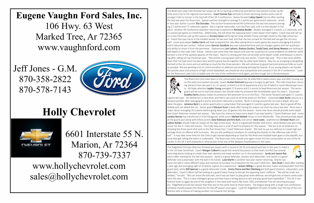 The Rivercrest Colts have been in the conversation about the 3A state title it seems every year and after missing out on the state tournament last year, Coach Hunter Robinson’ s group is hungry to get back. The Colts have four returning starters from last year’ s 21-11 squad, so there is a lot of experience and a lot of talent in south Mississippi County. All-State selection Jayden Young averaged 17.9 points and 5.3 assists to lead Rivercrest last season. The senior guard will be out to start the season, but should make his presence felt immediately upon his return. Classmate Buddha Harris always makes his presence felt wherever he is on the floor. The senior forward averaged 17.1 points a game last year. His athleticism is next level, and Harris can score at all three levels on the floor. Classmate Asier Burks returns to a forward position after averaging 8.2 points and seven rebounds a contest. Burks is strong around the rim and a leaper who can clean the glass. Jamarius Byrd is a senior guard who is a playmaker that averaged 6.1 points a game last year. Byrd is good off the dribble and can attack the rim. Senior guard Marquis Nunn is back after having his season cut short by injury last year. Nunn was a major factor averaging 10.3 points before going down just 10 games into the season. Some new faces should provide some depth that Coach Robinson needed last season.“ We have the chance to have more depth if we stay healthy,” Coach Robinson said. Junior Landon Barnes has transferred in from Paragould, while junior Markell Mickell moves in from Blytheville. They should provide depth at the guard spot along with fellow juniors Zane Robinson and Kris Burk, and senior Steve Lewis. Sophomores Christain Nunn and Lathon Bolden should make an impact at the high school level. Nunn is a good ball handler and scorer, while Bolden was also a big scorer for the Jr. Colts last season. The Colts have put in a lot of work to prepare for this season.“ We put a lot of emphasis on shooting the three point shot and on the free throw line,” Coach Robinson shared.‘ We look to use our defense to create high percentage shots on offense with turnovers. We are also putting an emphasis on crashing the boards on the offensive side of the ball.” It may take some time for the Colts to get started depending on how far the Rivercrest football team goes in the playoffs, but once they get rolling the talent is undeniable. The Rivercrest Colts should once again move into the conversation as one of the favorites in the 3A-3 and statewide in what proves to be one of the deepest classifications in the state.