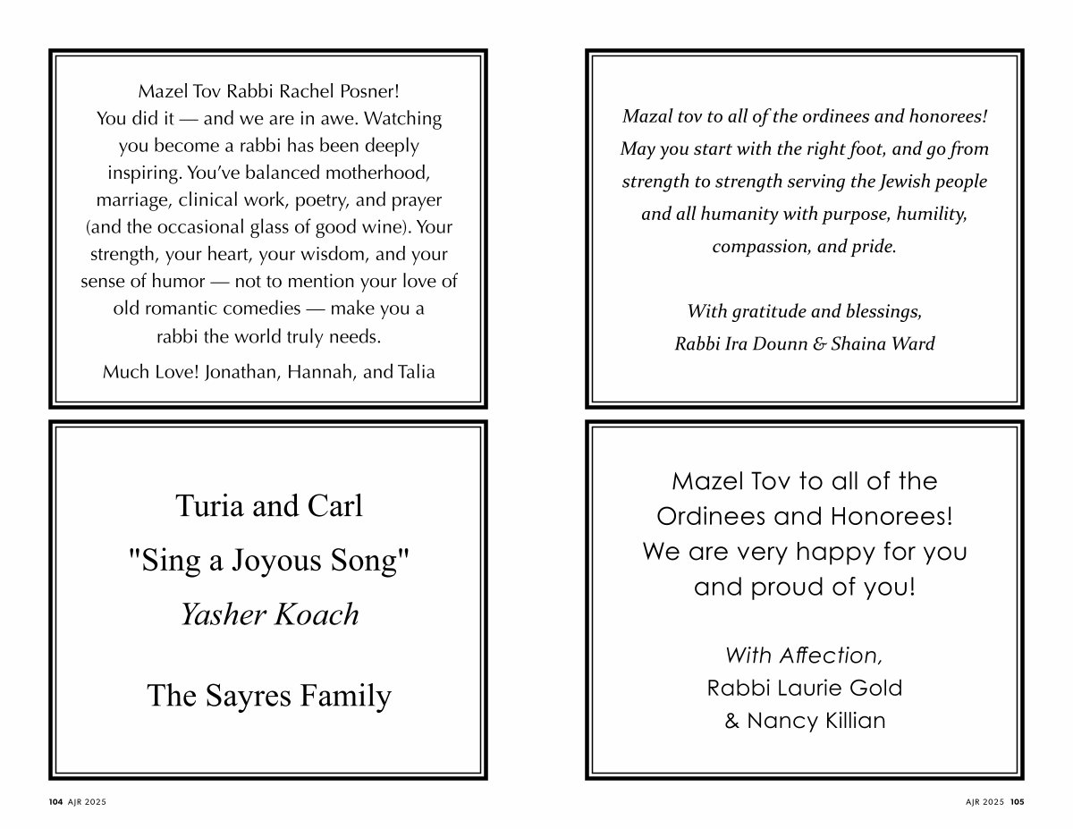 Mazal tov to all of the ordinees and honorees! May you start with the right foot, and go from strength to strength serving the Jewish people and all humanity with purpose, humility, compassion, and pride.