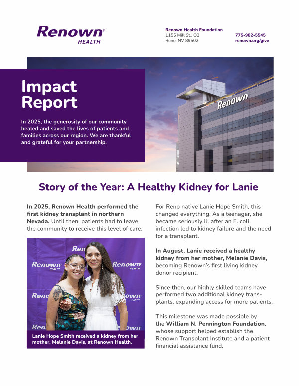 In 2025, Renown Health performed the first kidney transplant in northern Nevada. Until then, patients had to leave the community to receive this level of care.