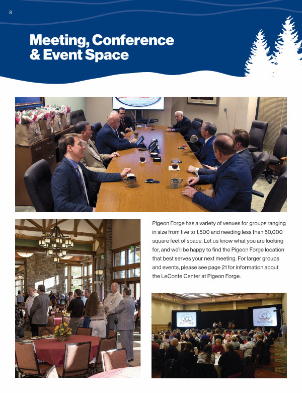 Pigeon Forge has a variety of venues for groups ranging in size from five to 1,500 and needing less than 50,000 square feet of space. Let us know what you are looking for, and we’ ll be happy to find the Pigeon Forge location that best serves your next meeting. For larger groups and events, please see page 21 for information about the LeConte Center at Pigeon Forge.