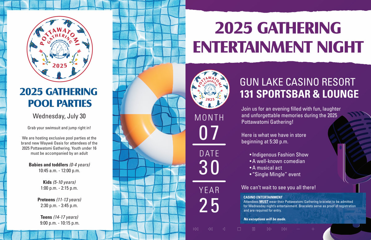 We are hosting exclusive pool parties at the brand new Waywé Oasis for attendees of the 2025 Pottawatomi Gathering. Youth under 16 must be accompanied by an adult