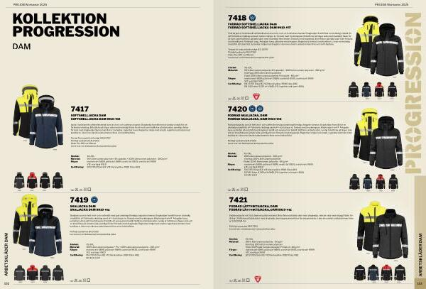 C44-C62 , D84-C120 1 : 92 % polyester , 8 % spandex - 250 g / m 2 Material 2 : 80 % polyester , 20 % bomull Material 3 : 100 % polyamide Förstärkningar : 100 % polyamide , Cordura ® gul / marin-10 , gul / svart-11 , orange / svart-1799 EN ISO 20471 Klass 1 C44-C50 , D84-D96 Klass 2 C52-C62 , D100-D120