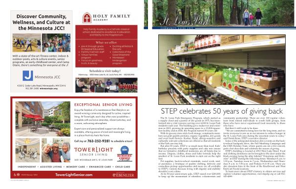 community partnership. There are over 120 regular volunteers from retired individuals to youth faith groups, from those who have never experienced food insecurity to those who have. But there’ s still work to be done.“ We are committed to being here for the long term, and we invite everyone to join us in our mission to reduce hunger in the St. Louis Park area during the uncertain years to come,” said Derek Reise, STEP’ s executive director.