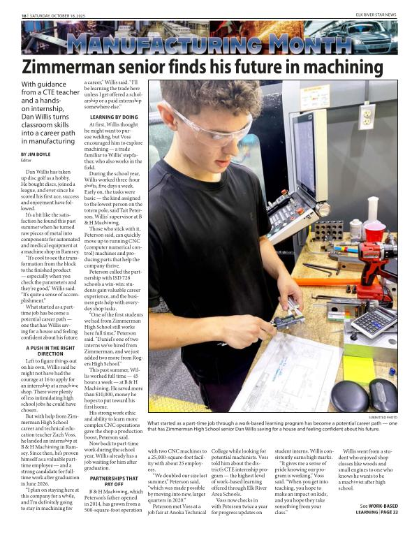 But with help from Zimmerman High School career and technical education teacher Zach Voss, he landed an internship at B & H Machining in Ramsey. Since then, he’ s proven himself as a valuable parttime employee— and a strong candidate for fulltime work after graduation in June 2026.