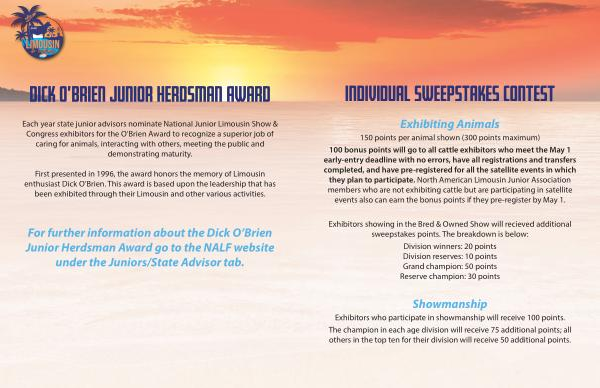100 bonus points will go to all cattle exhibitors who meet the May 1 early-entry deadline with no errors, have all registrations and transfers completed, and have pre-registered for all the satellite events in which they plan to participate. North American Limousin Junior Association members who are not exhibiting cattle but are participating in satellite events also can earn the bonus points if they pre-register by May 1.