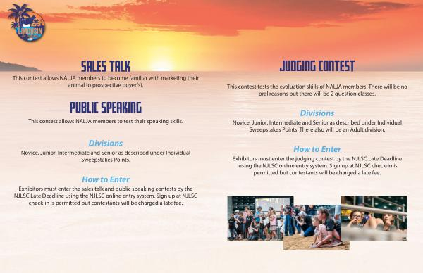 Exhibitors must enter the judging contest by the NJLSC Late Deadline using the NJLSC online entry system. Sign up at NJLSC check-in is permitted but contestants will be charged a late fee.