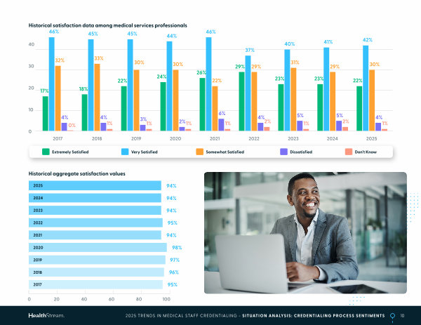 10 2025 TRENDS IN MEDICAL STAFF CREDENTIALING- SITUATION ANALYSIS: CREDENTIALING PROCESS SENTIMENTS 2021 2025 2020 2024 2019 2023 2018 2022 2017 Historical satisfaction data among medical services professionals Historical aggregate satisfaction values 40 30 20 10 0 Extremely Satisfied Very Satisfied Somewhat Satisfied Dissatisfied Don’ t Know 2024 23 % 41 % 29 % 5 % 2 % 2025 22 % 42 % 30 % 4 % 1 % 2023 23 % 40 % 31 % 5 % 1 % 2022 29 % 37 % 29 % 4 % 2 % 2021 26 % 46 % 22 % 6 % 1 % 2020 24 % 44 % 30 % 2 % 1 % 2019 22 % 45 % 30 % 3 % 1 % 2018 18 % 45 % 33 % 4 % 1 % 2017 17 % 46 % 32 % 4 % 0 % 94 % 94 % 95 % 94 % 94 % 98 % 97 % 95 % 96 % 0 20 100 80 60 40