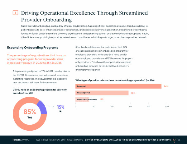 A further breakdown of the data shows that 94 % of organizations have an onboarding program for employed providers, while only 58 % have one for non-employed providers and 15 % have one for payeronly providers. This shows the opportunity to expand onboarding activities beyond employed providers and improve efficiency.