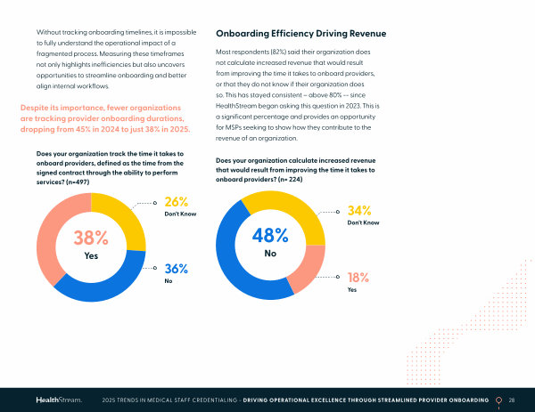 Most respondents( 82 %) said their organization does not calculate increased revenue that would result from improving the time it takes to onboard providers, or that they do not know if their organization does so. This has stayed consistent – above 80 %-- since HealthStream began asking this question in 2023. This is a significant percentage and provides an opportunity for MSPs seeking to show how they contribute to the revenue of an organization.