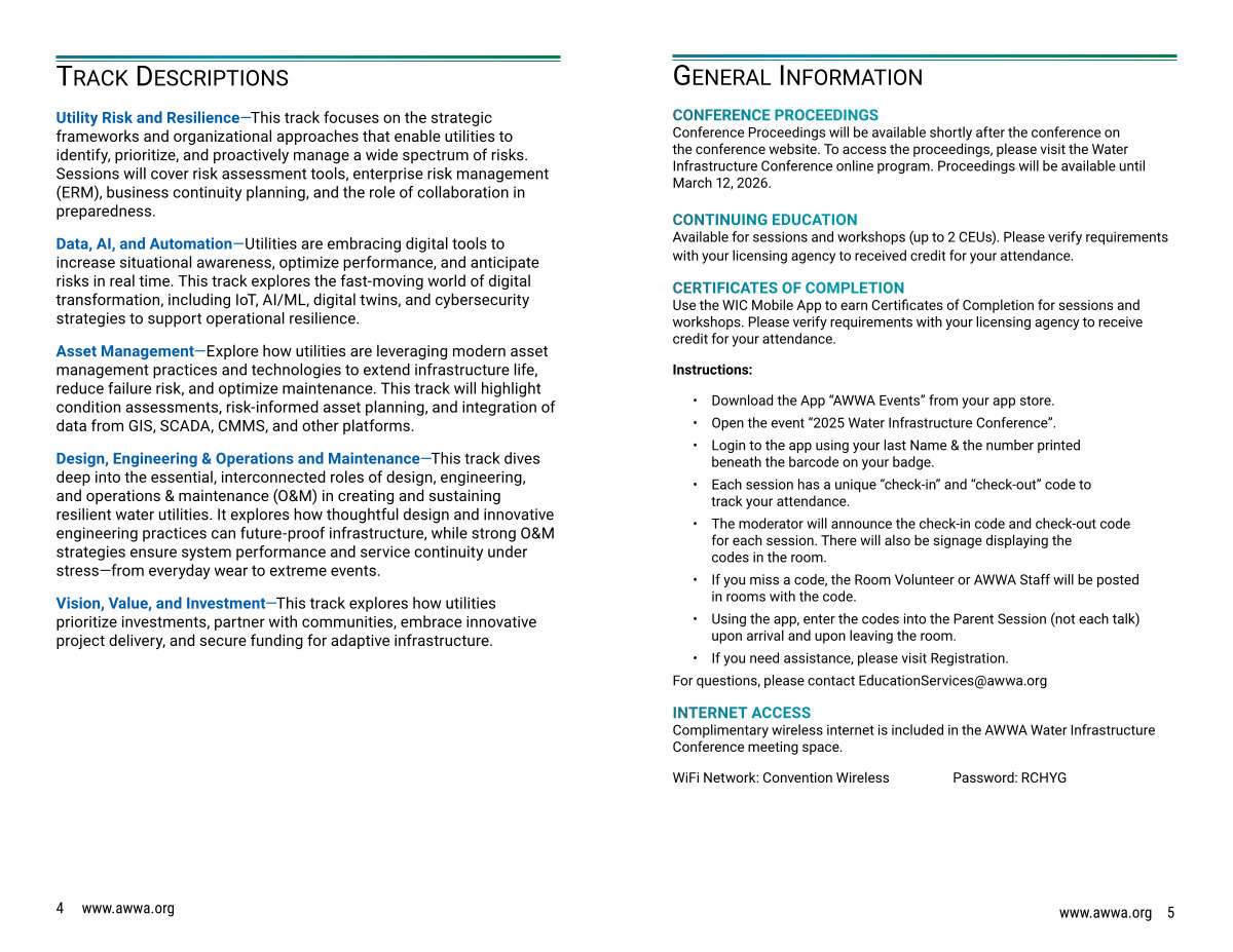 INTERNET ACCESS Complimentary wireless internet is included in the AWWA Water Infrastructure Conference meeting space.