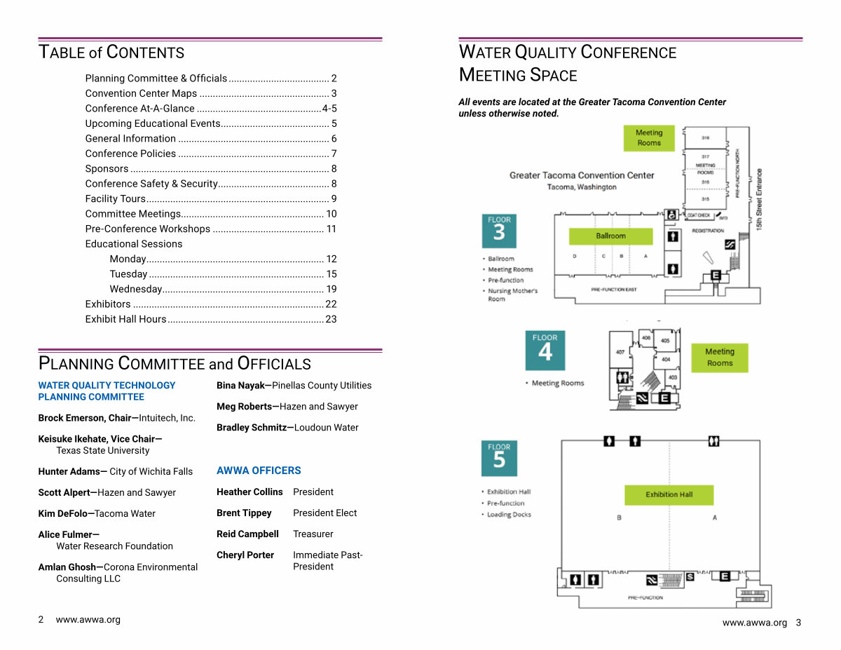 Planning Committee & Officials...................................... 2 Convention Center Maps................................................. 3 Conference At-A-Glance............................................... 4-5 Upcoming Educational Events......................................... 5 General Information......................................................... 6 Conference Policies......................................................... 7 Sponsors........................................................................... 8 Conference Safety & Security.......................................... 8 Facility Tours..................................................................... 9 Committee Meetings...................................................... 10 Pre-Conference Workshops.......................................... 11 Educational Sessions Monday................................................................... 12 Tuesday.................................................................. 15 Wednesday............................................................. 19 Exhibitors........................................................................ 22 Exhibit Hall Hours........................................................... 23