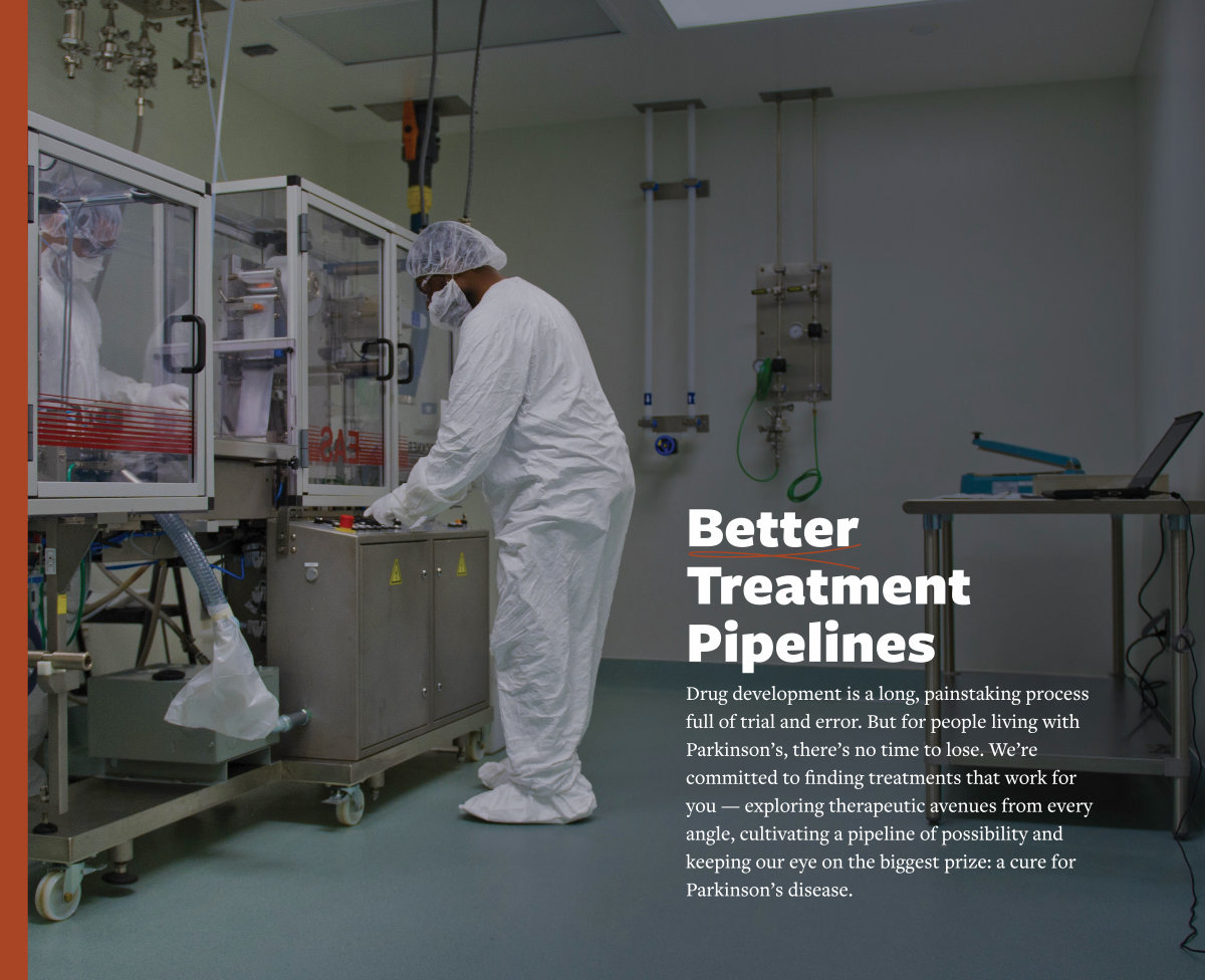 Drug development is a long, painstaking process full of trial and error. But for people living with Parkinson’ s, there’ s no time to lose. We’ re committed to finding treatments that work for you— exploring therapeutic avenues from every angle, cultivating a pipeline of possibility and keeping our eye on the biggest prize: a cure for Parkinson’ s disease.