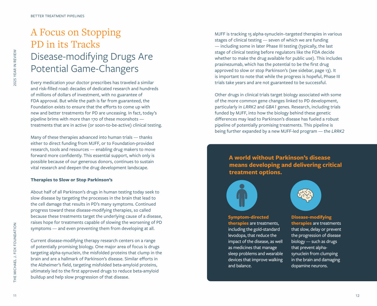 Many of these therapies advanced into human trials— thanks either to direct funding from MJFF, or to Foundation-provided research, tools and resources— enabling drug makers to move forward more confidently. This essential support, which only is possible because of our generous donors, continues to sustain vital research and deepen the drug development landscape.