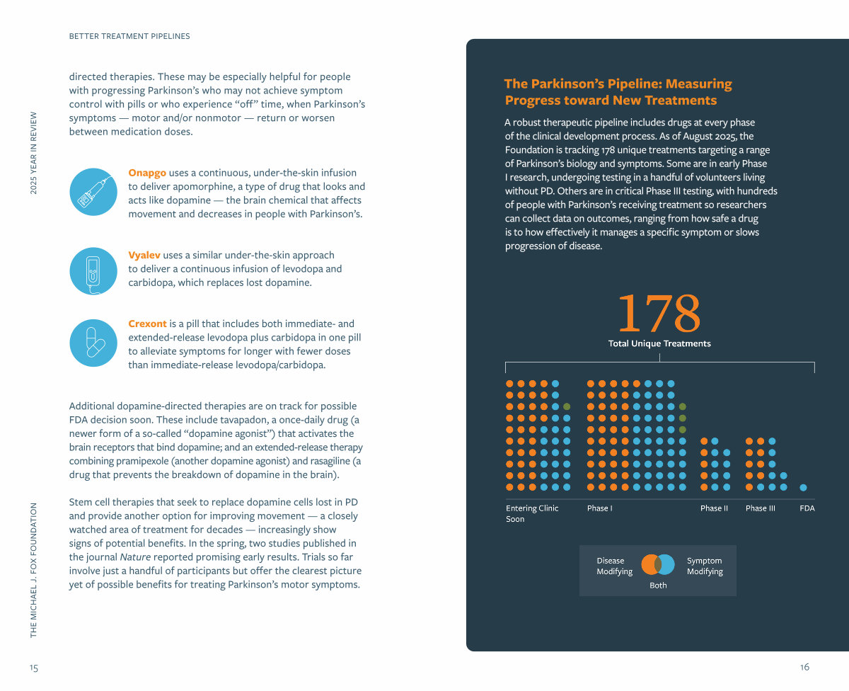 A robust therapeutic pipeline includes drugs at every phase of the clinical development process. As of August 2025, the Foundation is tracking 178 unique treatments targeting a range of Parkinson’ s biology and symptoms. Some are in early Phase I research, undergoing testing in a handful of volunteers living without PD. Others are in critical Phase III testing, with hundreds of people with Parkinson’ s receiving treatment so researchers can collect data on outcomes, ranging from how safe a drug is to how effectively it manages a specific symptom or slows progression of disease.