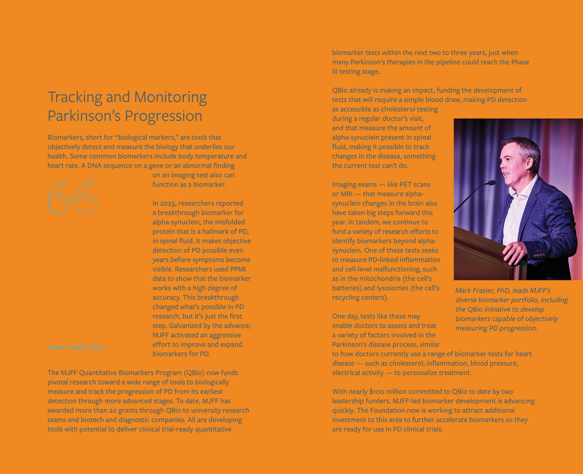 Mark Frasier, PhD, leads MJFF ' s diverse biomarker portfolio, including the QBio initiative to develop biomarkers capable of objectively measuring PD progression.
