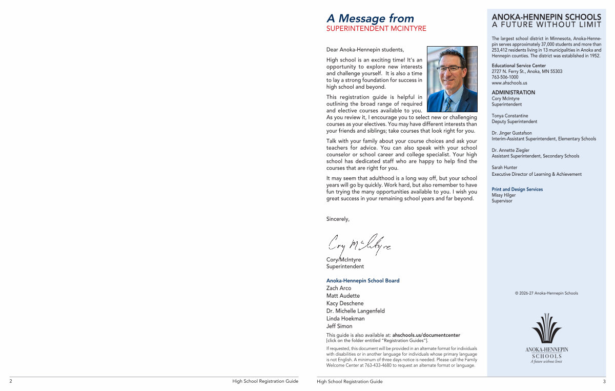 This registration guide is helpful in outlining the broad range of required and elective courses available to you. As you review it, I encourage you to select new or challenging courses as your electives. You may have different interests than your friends and siblings; take courses that look right for you.