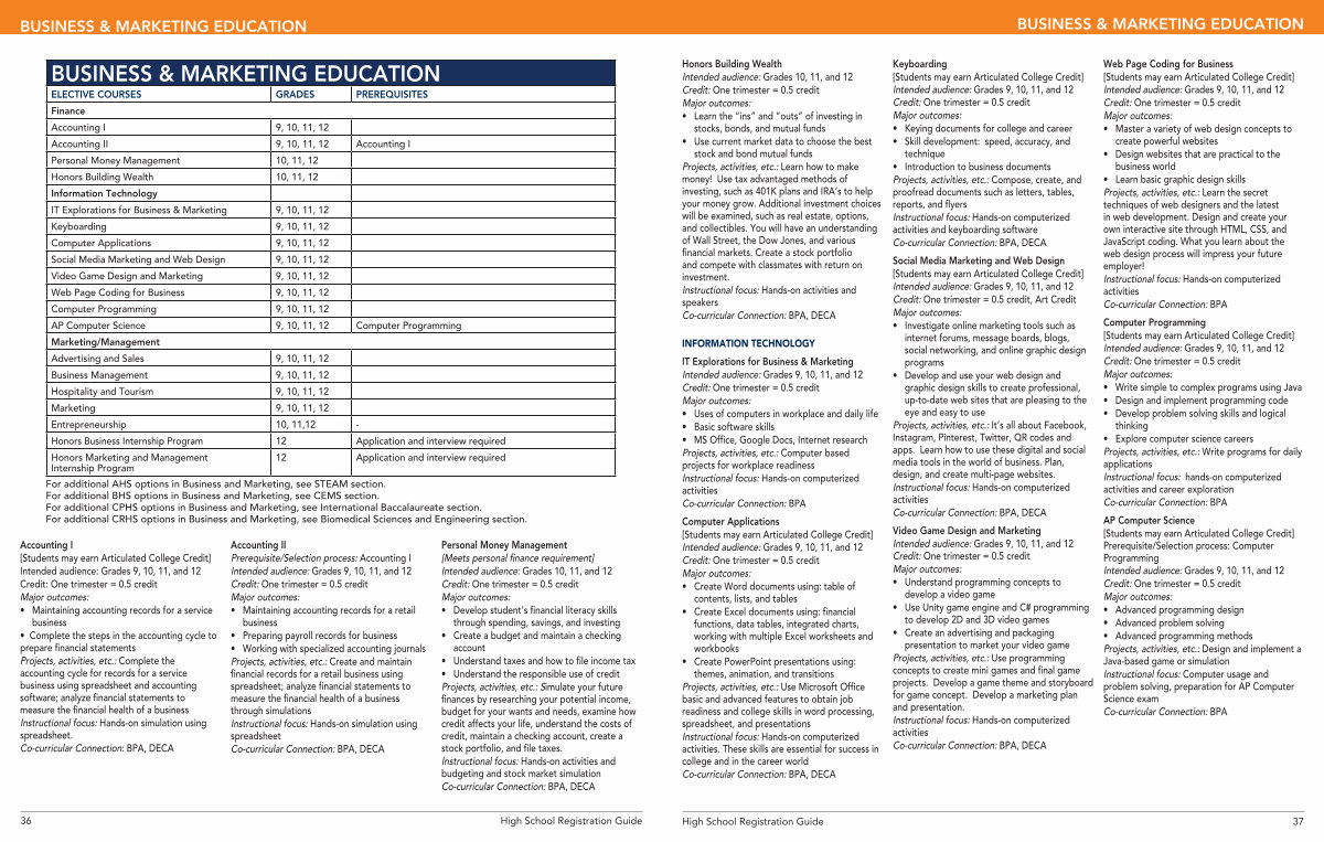 Projects, activities, etc.: Learn how to make money! Use tax advantaged methods of investing, such as 401K plans and IRA’ s to help your money grow. Additional investment choices will be examined, such as real estate, options, and collectibles. You will have an understanding of Wall Street, the Dow Jones, and various financial markets. Create a stock portfolio and compete with classmates with return on investment. Instructional focus: Hands-on activities and speakers Co-curricular Connection: BPA, DECA