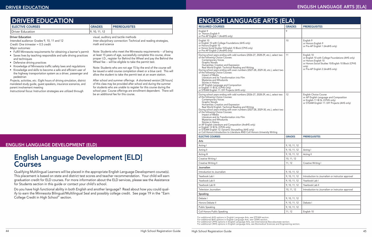 Qualifying Multilingual Learners will be placed in the appropriate English Language Development course( s). This placement is based on state and district test scores and teacher recommendation. Your child will earn graduation credit for ELD courses. For more information about the ELD services, please see the Assistance for Students section in this guide or contact your child’ s school.