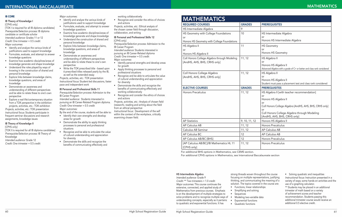 IB Theory of Knowledge I [ CPHS only ] [ TOK I is required for all IB diploma candidates ] Prerequisite / Selection process: IB diploma candidate or certificate scholar Intended audience: Grades 11 or 12 Credit: One trimester = 0.5 credit Major outcomes: