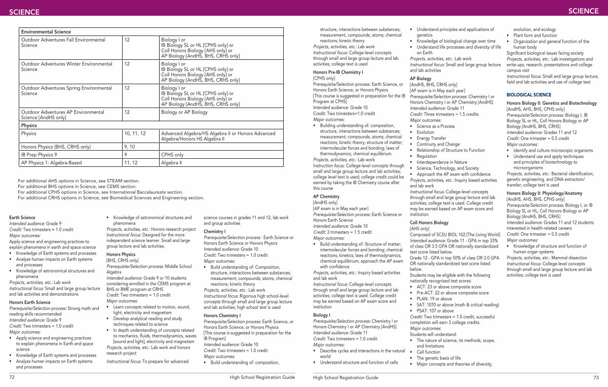 For additional AHS options in Science, see STEAM section. For additional BHS options in Science, see CEMS section. For additional CPHS options in Science, see International Baccalaureate section. For additional CRHS options in Science, see Biomedical Sciences and Engineering section.