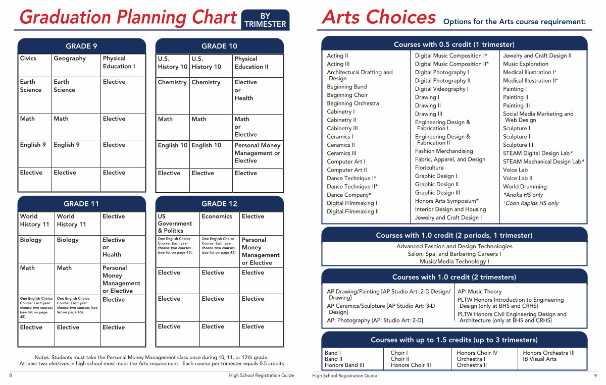 Notes: Students must take the Personal Money Management class once during 10, 11, or 12th grade. At least two electives in high school must meet the Arts requirement. Each course per trimester equals 0.5 credits