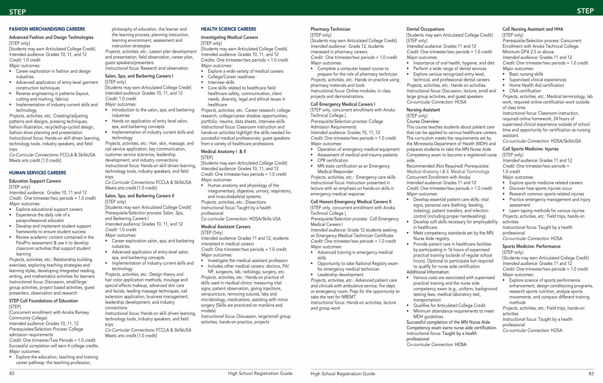 STEP Coll Foundations of Education [ STEP ] [ Concurrent enrollment with Anoka Ramsey Community College ] Intended audience: Grades 10, 11, 12 Prerequisites / Selection Process: College admission requirements Credit: One trimester / Two Periods = 1.0 credit Successful completion will earn 4 college credits. Major outcomes: