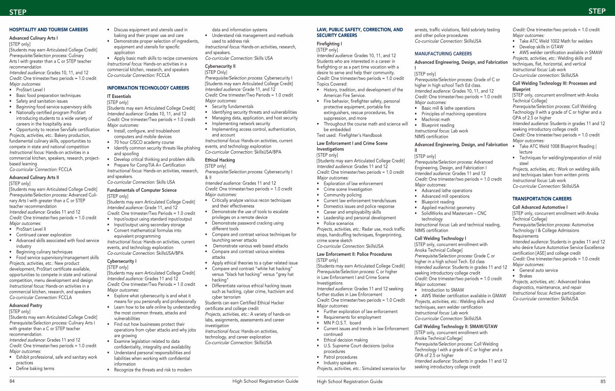 Advanced Culinary Arts I [ STEP only ] [ Students may earn Articulated College Credit ] Prerequisite / Selection process: Culinary Arts I with greater than a C or STEP teacher recommendation Intended audience: Grades 10, 11, and 12 Credit: One trimester / two periods = 1.0 credit Major outcomes: