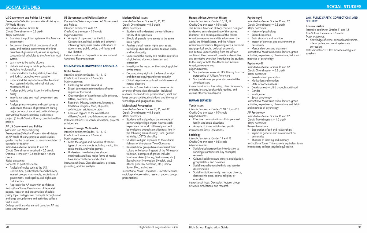 AP US Government and Politics [ AP exam is in May each year ] Prerequisites / Selection Process: World History or AP World History; previous social studies grades may be considered or recommendation of counselor or teacher Intended audience: Grades 11 and 12 Credit: One trimester required = 0.5 credit Optional Trimester = 0.5 credit Non-Honors Credit Major outcomes: Concepts of political science
