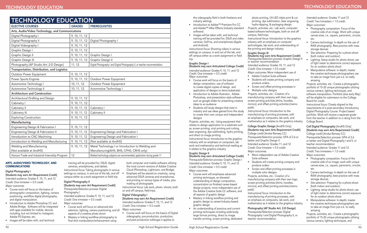 College Graphic Design [ AndHS Only ] [ Students may earn Arts Requirement Credit ] College credit [ Anoka Ramsey CC ] Prerequisite / Selection process: GPA of 2.6 or better and Graphic Design II Intended audience: Grades 11, and 12 Credit: One trimester = 0.5 credit Major outcomes:
