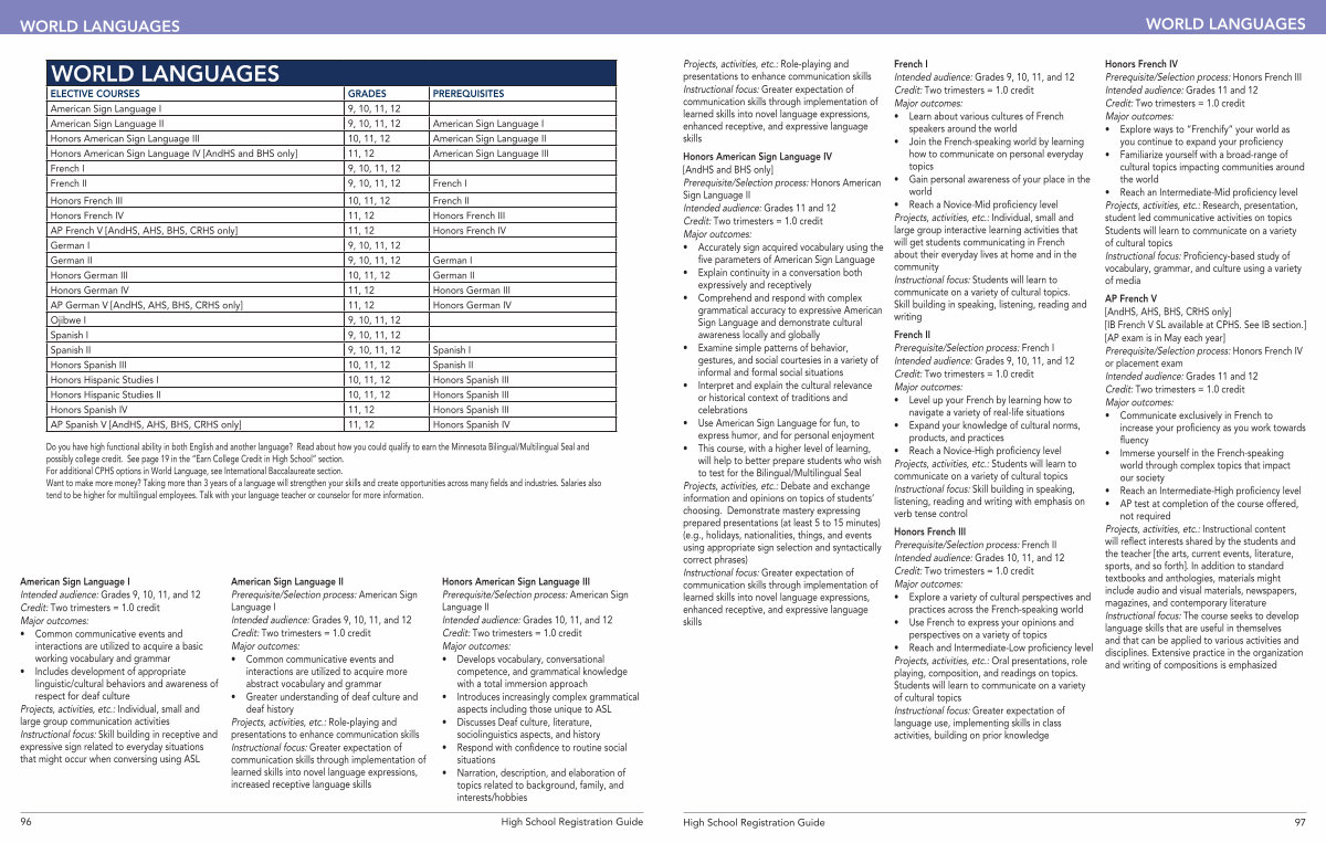 Honors American Sign Language IV [ AndHS and BHS only ] Prerequisite / Selection process: Honors American Sign Language II Intended audience: Grades 11 and 12 Credit: Two trimesters = 1.0 credit Major outcomes: