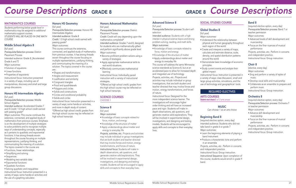 [ full year ] Prerequisite / Selection process: District Placement Process Intended audience: Grade 8, [ Accelerated Grade 6 and 7 ] Major outcomes: