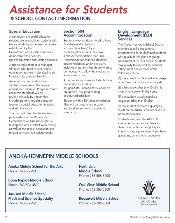 The Anoka-Hennepin School District provides specific educational programming for multilingual students who qualify for English Language Development( ELD) Services. Students may qualify to receive ELD services if they meet one or more of the following criteria: