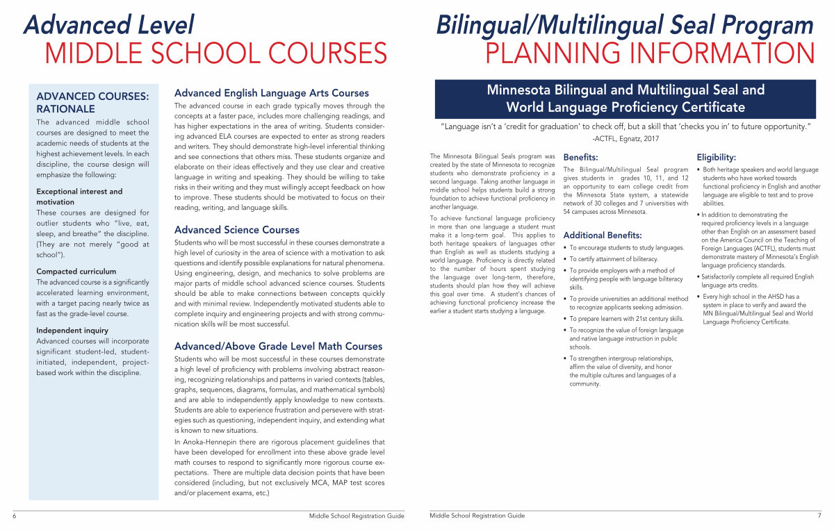 Students who will be most successful in these courses demonstrate a high level of proficiency with problems involving abstract reasoning, recognizing relationships and patterns in varied contexts( tables, graphs, sequences, diagrams, formulas, and mathematical symbols) and are able to independently apply knowledge to new contexts. Students are able to experience frustration and persevere with strategies such as questioning, independent inquiry, and extending what is known to new situations. In Anoka-Hennepin there are rigorous placement guidelines that have been developed for enrollment into these above grade level math courses to respond to significantly more rigorous course expectations. There are multiple data decision points that have been considered( including, but not exclusively MCA, MAP test scores and / or placement exams, etc.)