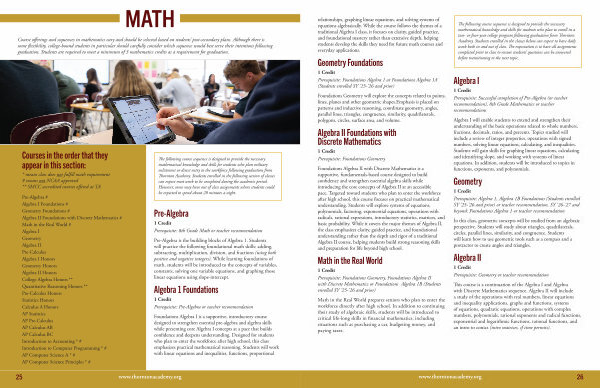 Whether your journey at Thornton Academy begins in sixth grade at TAMS, ninth grade at the upper school or encompasses a one year stint for your senior year, use these pages as your guide book. This academic book will help show the many routes and paths you can take to find success during your time on campus and for the adventures that await you after graduation. Whichever path you choose, Thornton Academy and the knowledge and experiences you gain here will provide appropriate challenges that prepare you to become who you want to be.
