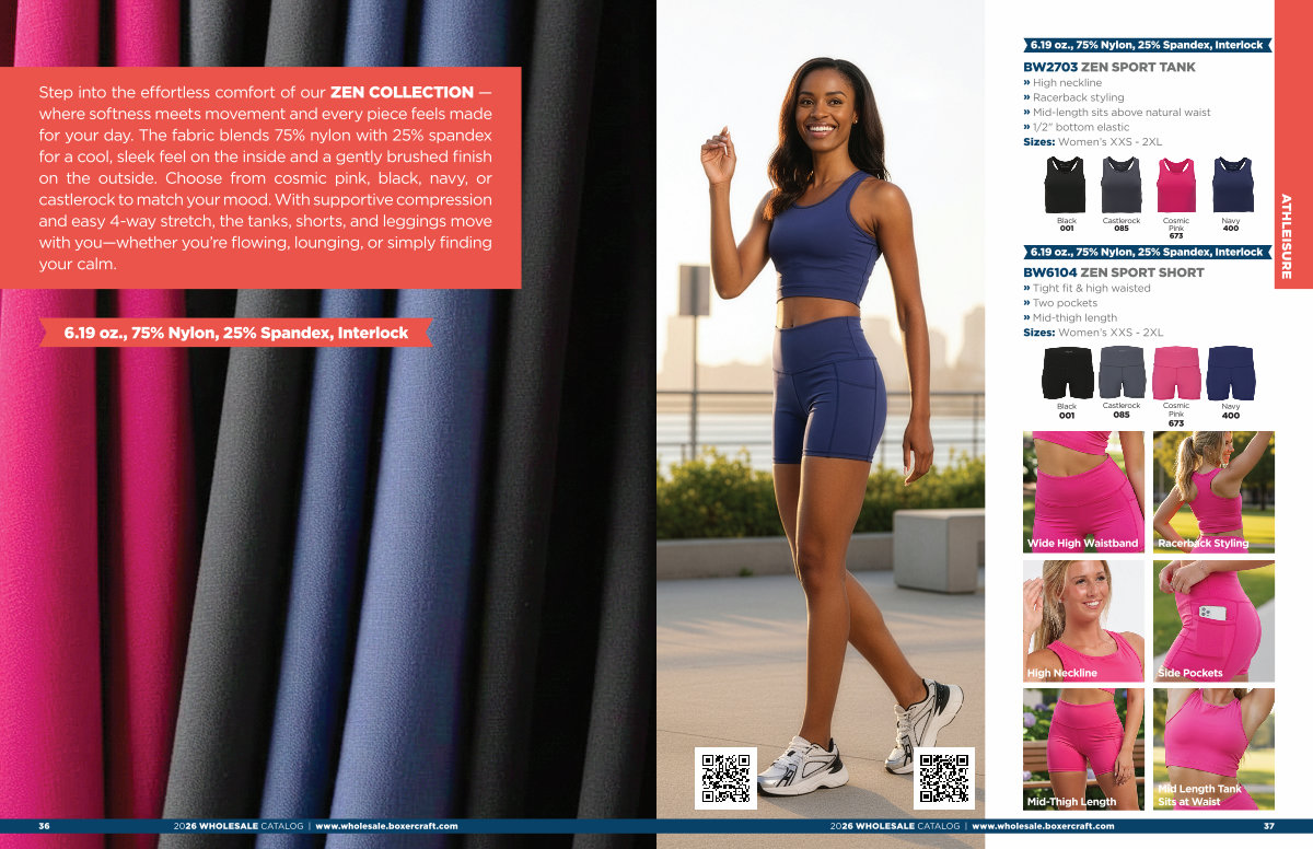 Step into the effortless comfort of our ZEN COLLECTION— where softness meets movement and every piece feels made for your day. The fabric blends 75 % nylon with 25 % spandex for a cool, sleek feel on the inside and a gently brushed finish on the outside. Choose from cosmic pink, black, navy, or castlerock to match your mood. With supportive compression and easy 4-way stretch, the tanks, shorts, and leggings move with you— whether you’ re flowing, lounging, or simply finding your calm.