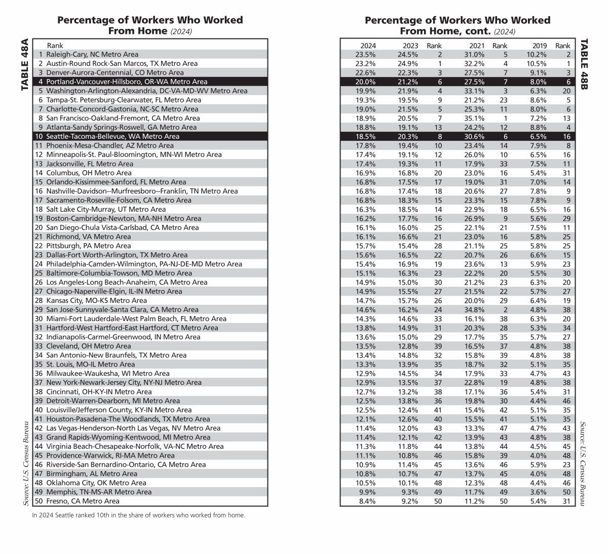 In 2024 Seattle ranked 10th in the share of workers who worked from home.