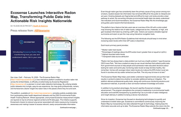 San Jose, Calif.- February 19, 2026- The Ecosense Radon Map [ https:// radonmap. ecosense. io /], a new interactive platform created to visualize radon risk across the United States, is officially unveiled today by Ecosense Registered [ https:// ecosense. io /], a pioneer in smart radon detection technology. By unifying reliable public datasets into a single, easy-to-use experience, the map gives professionals, renters, and homeowners clearer insight into radon risks in the places where they live and work.
