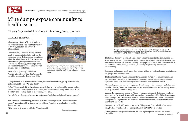 Tailing mountains loom over the perimeter of Riverlea, a residential neighborhood west of Johannesburg. Australian George Harrison began prospecting for gold in this area in the late 1880s. PHOTO: ZACH PODOLNICK’ 26 / THE HAWK