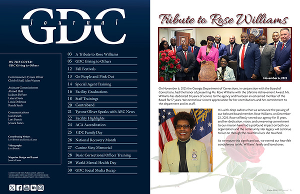 On November 6, 2025 the Georgia Department of Corrections, in conjunction with the Board of Corrections, had the honor of presenting Ms. Rose Williams with the Lifetime Achievement Award. Ms. Williams has dedicated 34 years of service to the agency and has been an esteemed member of the Board for 17 years. We extend our sincere appreciation for her contributions and her commitment to the department and its staff.