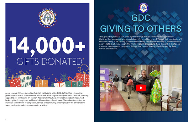 Throughout the year, GDC staff came together through multiple fundraisers to support Clark’ s Christmas Kids, a program that provides holiday gifts to children in need. Through their contributions, 112 children currently in the custody of the Division of Family and Children Services( DFCS) received muchdeserved gifts this holiday season. This initiative not only brings joy to these children but also fosters a sense of community and compassion during a time that can be especially challenging for those in difficult circumstances.